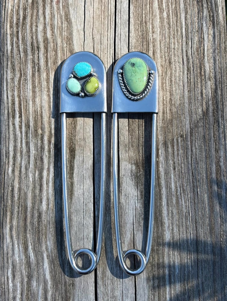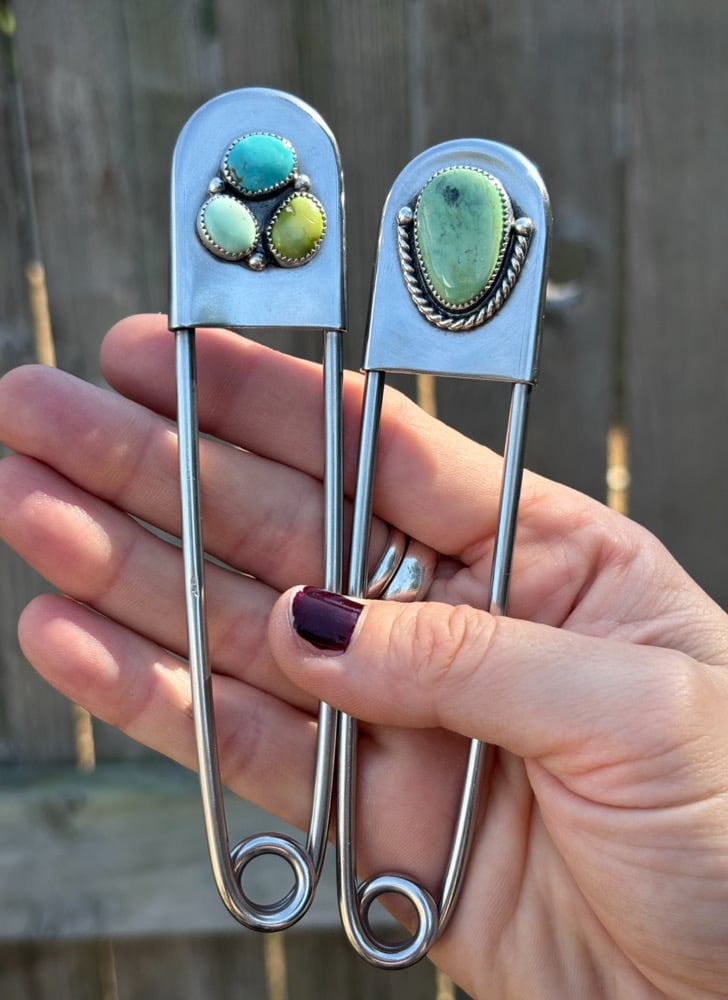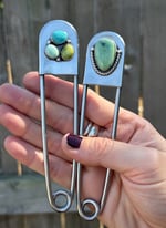 5 inch stainless steel safety pin with sterling and fine silver details.