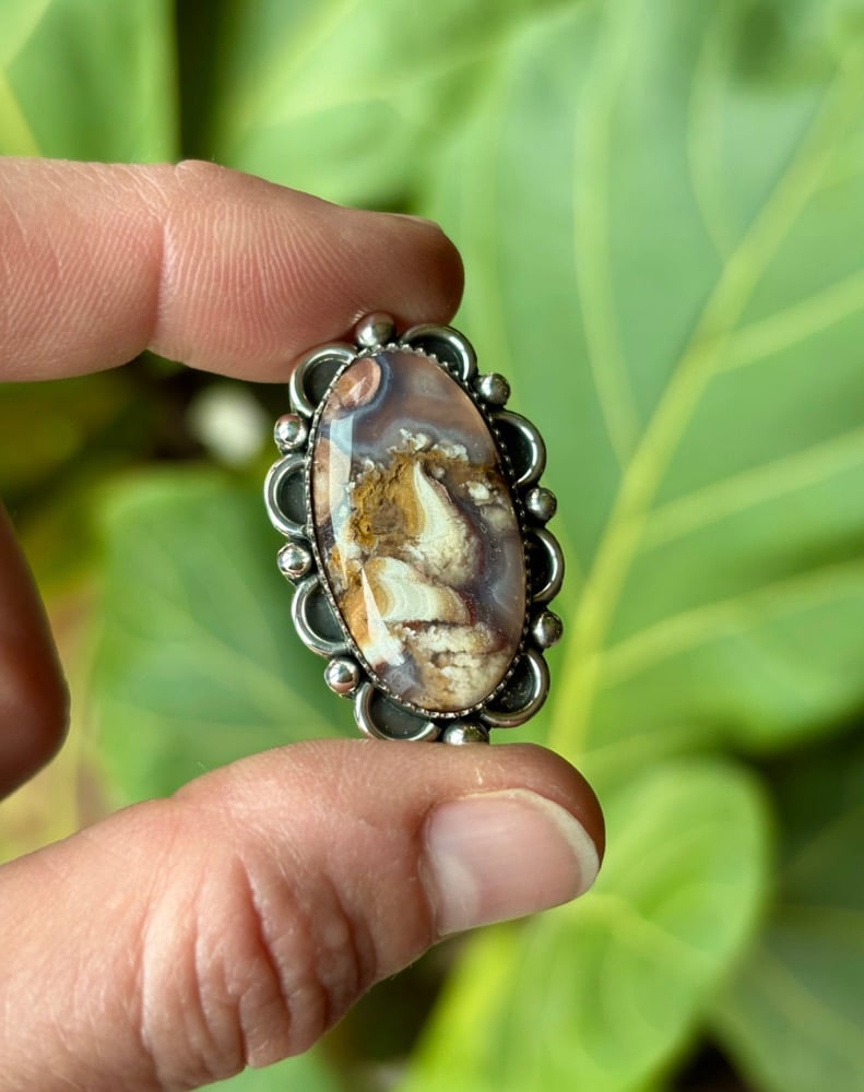 Large La riviera plume agate, sterling and fine silver.