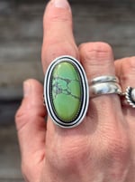 Gorgeous green Hubei Turquoise, set in sterling and fine silver. Ring measures just under 1 1/2 inches in length.